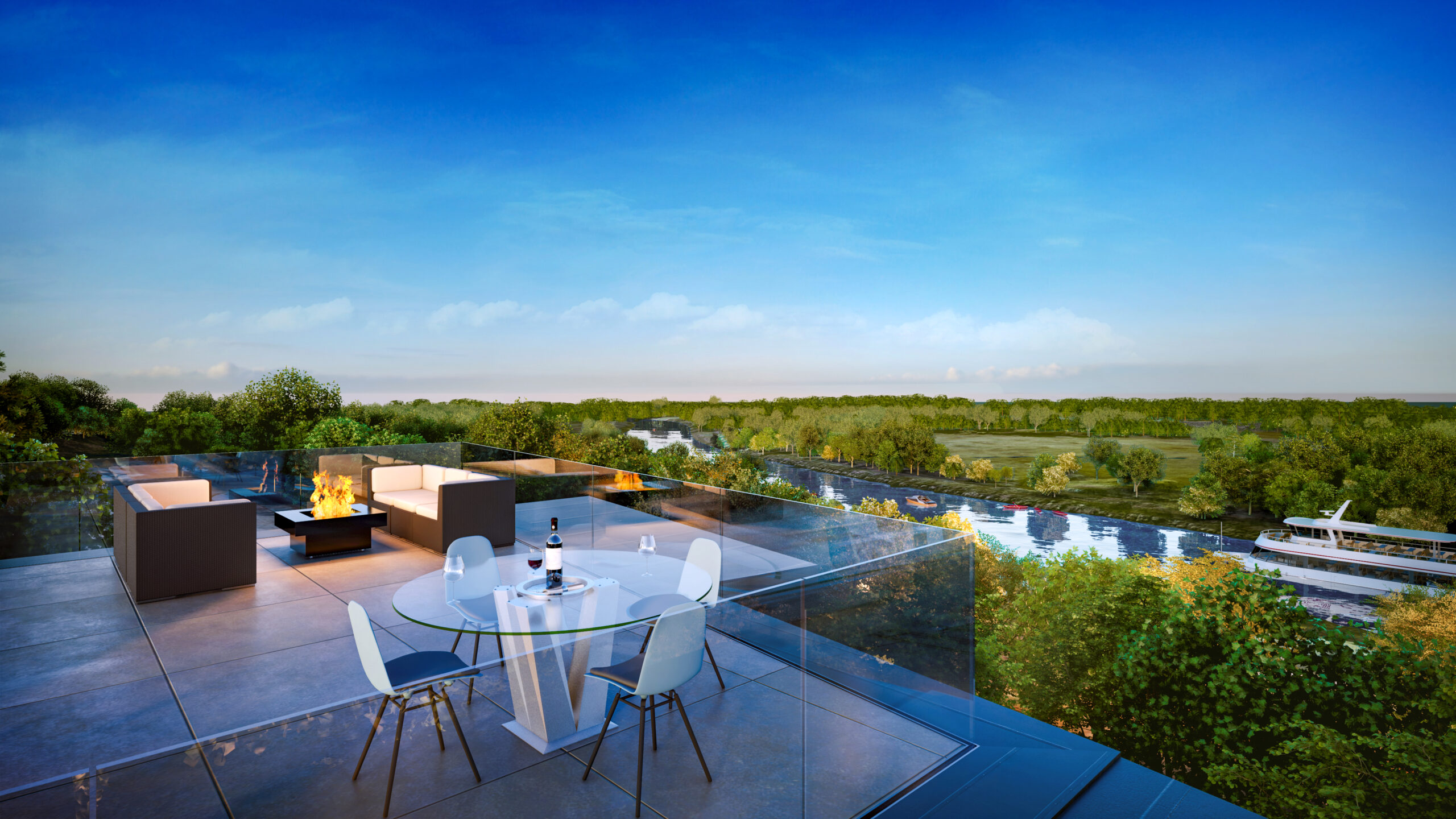 Taras dachowy zapewnia przestrzeń o kameralnym ale jednocześnie luksusowym charakterze z widokiem na szeroką panoramę rzeki.